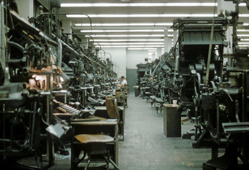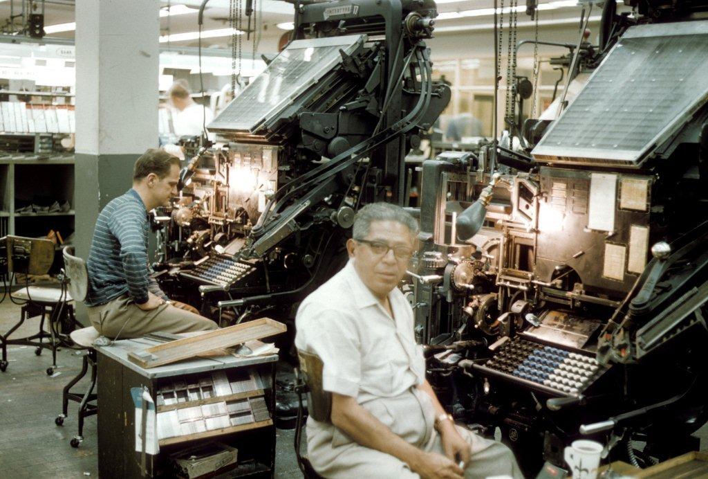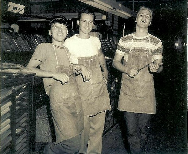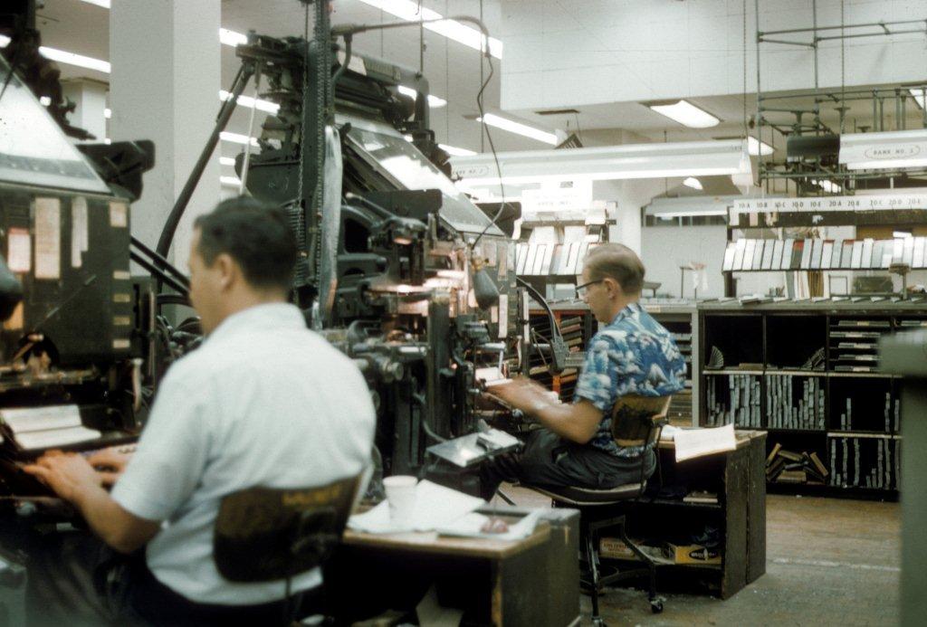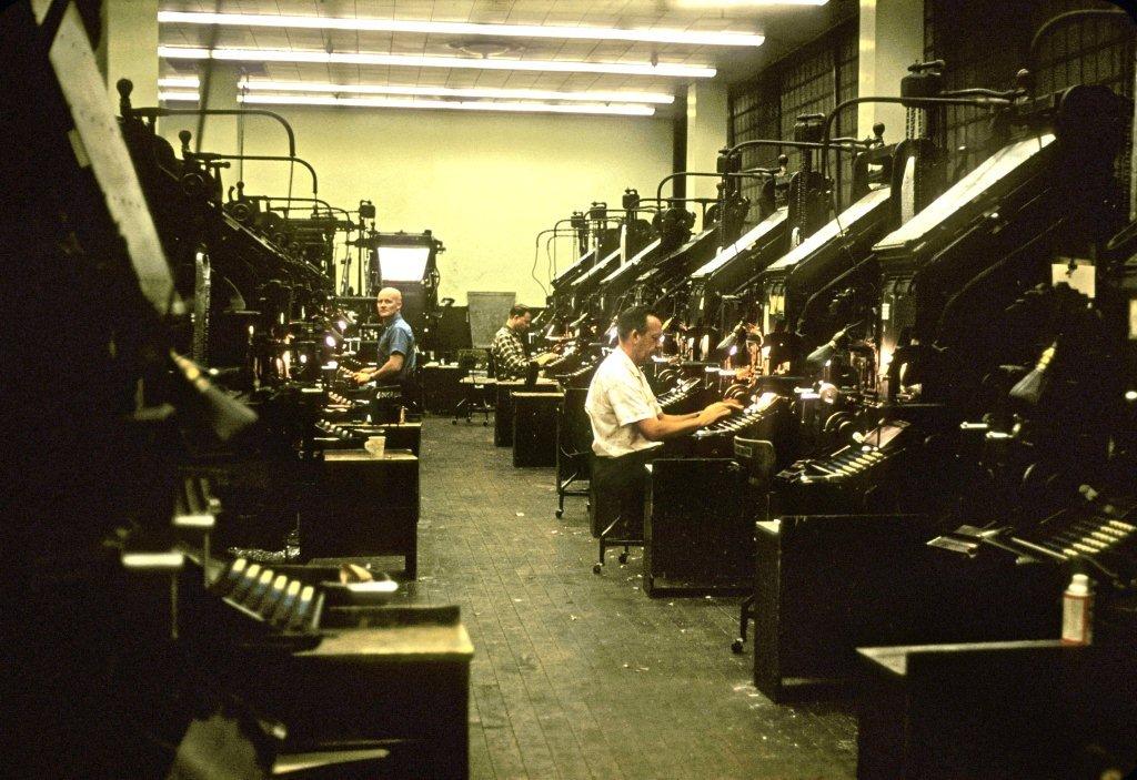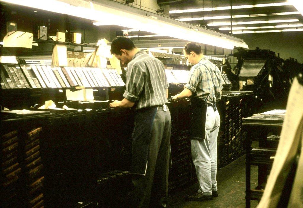 Linotype operators. On the left is Brian Stevens, behind him in the middle is Austin Reinitz,